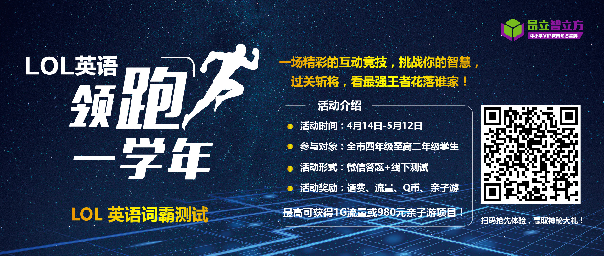 同时,为了给同学们提供更多的展示机会,由2017“未来之星”特别支持单位昂立智立方研发的“LOL(Law Of Learning)英语词霸测试”,旨在面向全市各年龄段学生,通过趣味测试,让学生了解自身英语水平,做到查漏补缺!